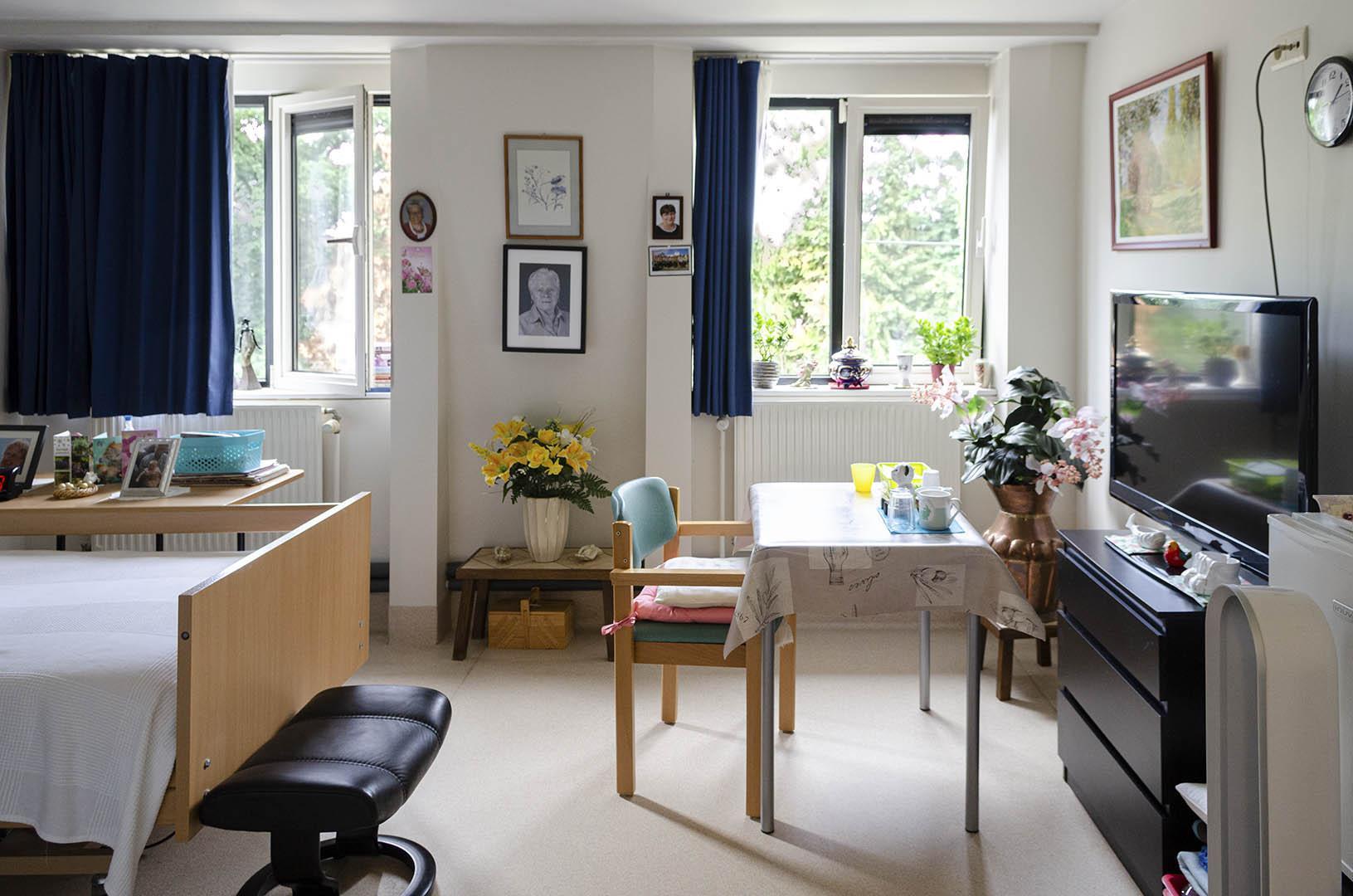 La résidence dispose de 68 chambres, individuelles ou doubles. Ces dernières comprennent d’office un lit médicalisé, un fauteuil pour se relaxer, une cabine toilettes-lavabo ainsi qu’une petite table de lit. Il est également possible de louer un téléphone, un frigo et une télévision.