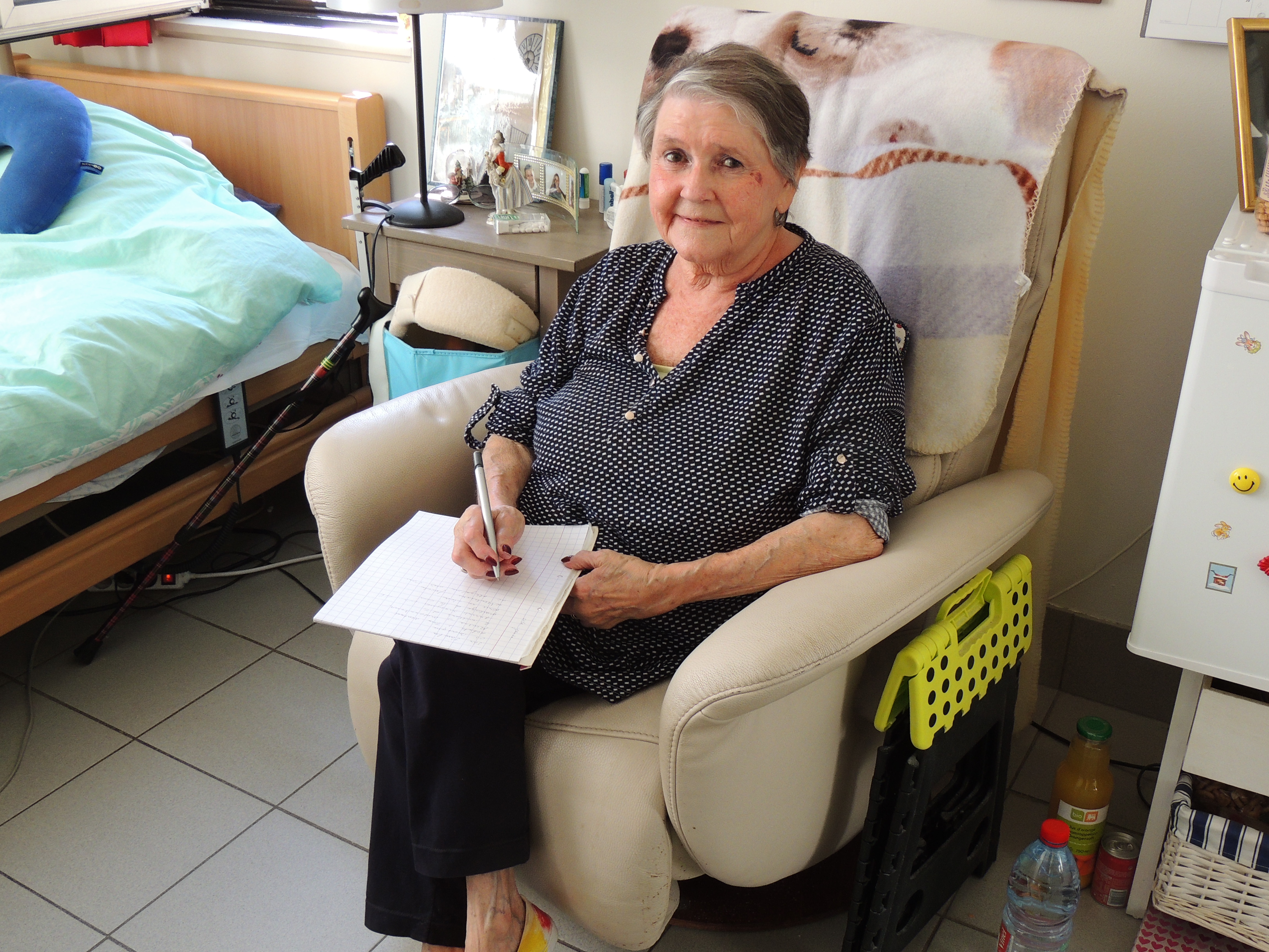 En repensant à ma dernière demeure, je dirais que je suis chanceuse d’être à Béthanie. J’ai une petite chambre bien accueillante parce que mon âme y vit. Pour aller dîner je me prépare comme si c’était dimanche ! La nourriture nous réserve de bonnes surprises et nous avons droit à la bière et au vin chaque semaine et aux apéritifs lors de grandes occasions. Je suis également très heureuse de voir qu’ici on ne s’ennuie pas ! En effet, je ne refuse jamais les activités proposées par l’ergothérapeute. Les soins me direz-vous, et bien l’équipe vous chouchoute comme si vous étiez de la famille, même lors de soins plus délicats. Quand il fait beau, on n’oublie pas nos muscles et on en profite pour se promener dans le domaine. Quel bonheur d’être dans un lieu si agréable !